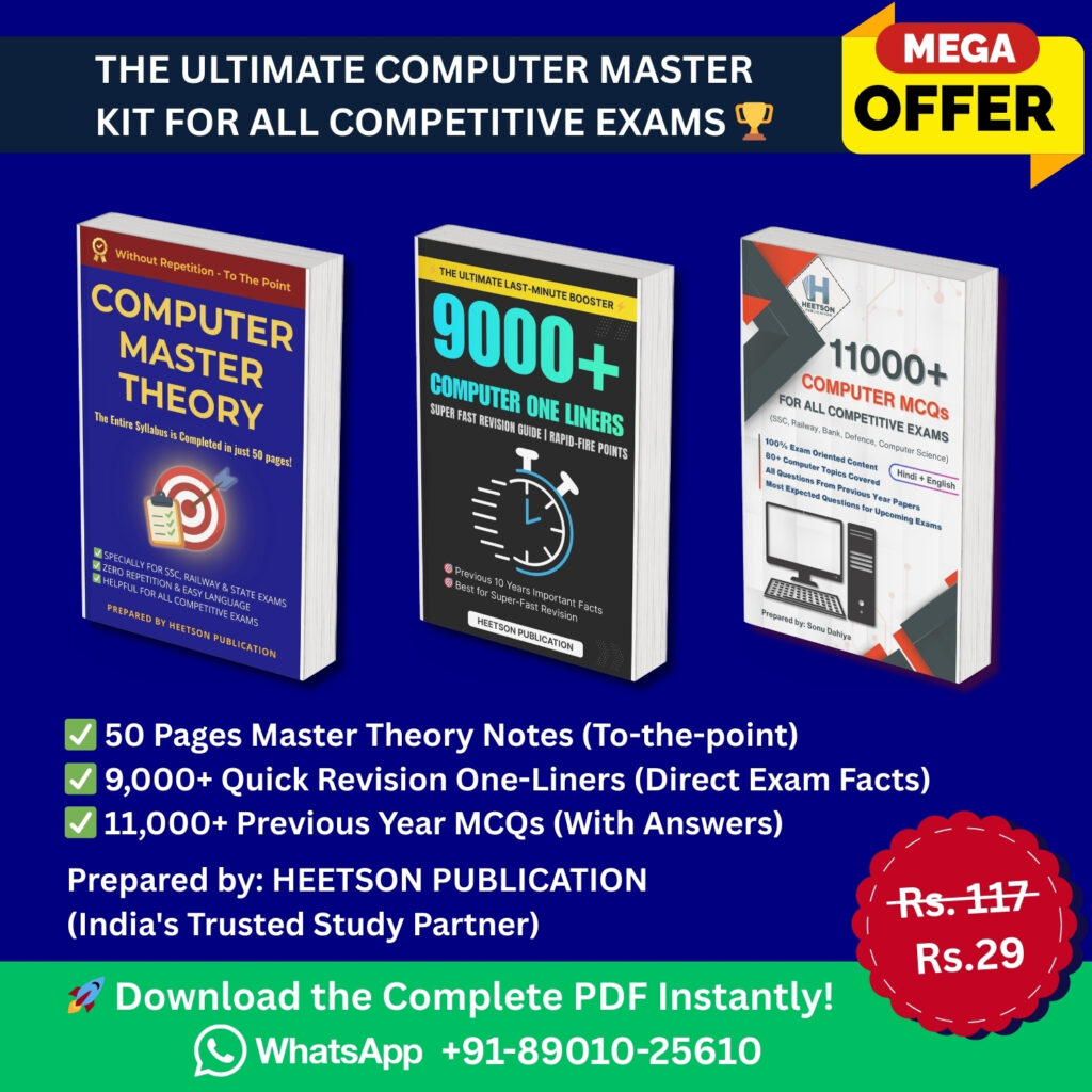 Computer MCQ E-Book for all Competitive Exams. Most important Objective type multiple choice Questions and answers in Hindi English. All MCQs collected from previous years question papers. Beginners, Intermediate & Advanced Level. Helpful for AAI, AEES TGT, AHSEC CSCA, AIBE, AIIMS CRE, Akola DCC Bank Junior Clerk, Bank PO, Allahabad High Court (APS, ARO, Computer Assistant, RO), APCOB (Manager, Staff Assistant), APPSC (Group 1, Polytechnic Lecturers (Commercial & Computer)), Army (Agniveer, GD), AWES PGT, Axis Bank, BCA, Bank of Baroda, Bank of India SO, BARC (DAE, Engineer CS), BARD NRB Group C (Stenographer), BCC Bank Junior Assistant , BCS, BEL, BELTRON (DEO, Programmer), BEML Non Executive, BHEL, BHU Junior Clerk, Bihar (Civil Court, District Court, Jeevika, Lekhpal IT Sahayak, Police Constable, Secondary Teacher Computer Science, State Cooperative Bank, TRE Senior Secondary Teacher (CS), Vidhan Parishad DEO), BMC Bank JEA, BOB (Acquisition Officer, Apprentice, Assistant, LBO), BOI, Bombay High Court, BPSC (Assistant Teacher, Head Teacher), BSc, BSCB Multipurpose Assistant, BSF Head Constable , BSNL (JTO, JE TTA, Junior Engineer, Computers Specialization), BSPHCL (Correspondence Clerk, Junior Accounts Clerk, Technician), BSSC, BSST, BTech, CAPF Head Constable ASI, CBSE (Class 10 CS, Superintendent), CCBP, CCC, CDS, Central Bank (Apprentice, Credit Officer), Central Bank of India ZBO, Chandigarh Police SI, CG Vyapam (Assistant Teacher, Patwari), CGL RE, CGPSC AE, Chandigarh TGT, Chhattisgarh Patwari, CISF (ASI LDCE, Head Constable), CITS/CTI Computer operator and programming assistant Entrance, COPA, ITI Training Officer, Corporation Bank PO, CPCB Scientist B (Information Technology/CS), CRPF ASI (Steno), CSA, CSAT, CSBC Bihar Police Prohibition Constable, CSE, CSIR (CLRI, NET), CSPHCL JE CS, CHNM, IT & ITeS, Cyber Olympiad, DCA, DCC Bank Junior Assistant, DDA (JSA, Patwari), Delhi Metro, Delhi Police (Head Constable, MTS), DFCCIL Junior Executive, DMRC (Delhi Metro Rail Corporation) CRA, DOEACC A Level, O level, DRDO (CEPTAM Tech-A, CURDE, CVRDE, GTRE, DSE Odisha TGT, DSSSB (Grade-IV Junior Assistant, LDC, Manager, Patwari, PGT), DTU DEO, ECGC PO, ECIL, ECILO, EMRS (Accountant, Hostel Warden, JSA, Lab Attendant, Librarian), EPFO (SSA, Stenographer), ESIC (SSO, UDC), EXIM Bank Management Trainee, FACT, FCI (Assistant Grade 3, Manager, Stenographer), Federal Bank Associate Officer, FMTTI, FSSAI (Senior/Assistant Manager IT, Technical Officer), GATE CSE, GIC, GMRC Maintainer, Goa PWD (JE Computer, Technical Assistant IT), Government of India Press, GP Parsik Sahakari Bank Junior Officer, GPSC, GROUP INSTRUCTOR, GSECL Junior Programmer, Gujarat Police LRB Constable, H.C. Ald. (ARO), HAL Management Trainee, Haryana HPSC, Patwari, HBSE Class 10 (Computer), HMT, HNL, HPSC (Assistant Professor, Polytechnic Lecturer in Computer Engineering, Lecturer in Office Management and Computer Application (OMCA), HPSCB, HSSC (CET, Gram Sachiv, Group D), HST IT, IB (ACIO, Junior Intelligence Officer, Security Assistant), IBPS (AFO, IT Officer, SO, Specialist Officer), ICMR Assistant, ICSE Class 9 Computer Application, IDBI (Assistant Manager, Executive, JAM), IFSCA, IGNOU Junior Assistant Cum Typist, IIBF CAIIB, IIFCL, Indian Army, Indian Bank, Navy, Indian Overseas Bank LBO, Indian Rare Earth Limited, Infosys, INFY TQ, IOB PO, IOCL, ISRO (IPRC, ICRB Scientist CS, Satellite Centre Bengaluru, Assistant, Technician B CS, UDC), ITBP, ITI (CHNM, COPA, Steno English), J2SE, JAIIB, JCI Junior Inspector, JKSSB (Accounts Assistant, Draftsman, Sub-Inspector), JNU, JPR, JPSC,JRF (Library & Infor.Scie.), JSS CGL, JSSC (Assistant, CGL, Lab Assistant, LDC, Lower Division Clerk, SI), Karnataka Bank, Karnataka Village Accountant, Kerala PSC, KVS (Assistant Section Officer, Junior Secretariat Assistant, Librarian, Senior Secondary Assistant), LIC (AAO, ADO, HFL), LMRC SC/TO, Maharashtra (Police Constable, Talathi Bharti), MCA, MCS, MDU BCA,